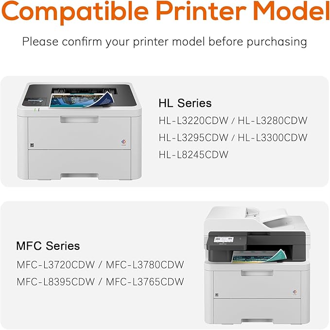 - Compatible Printers: The Jeostarky TN229XL toner cartridges are compatible with brother HL-L3280CDW, HL-L3220CDW, HL-L3300CDW, HL-L3295CDW, HL-L8245CDW, MFC-L3780CDW, MFC-L3720CDW, MFC-L3765CDW, and MFC-L8395CDW