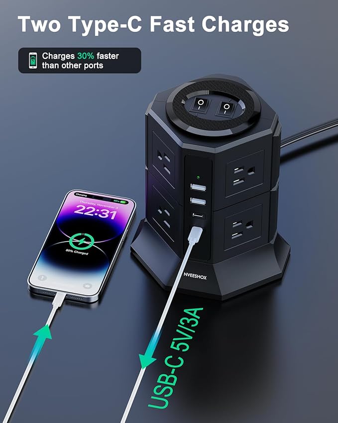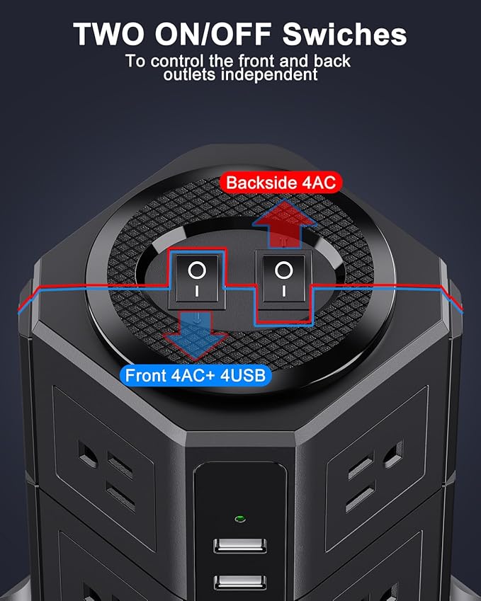 - SEPARATED DUAL SWITCHES: The top of the surge protector power strip tower has two independent switches that control the power strip surge protector tower on/off of both sections, making it easy to turn off multiple unused electronic devices without having to plug and unplug the switches, making it easier for you to manage all your connected devices and reduce power supply waste.
