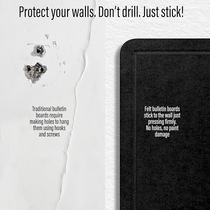 - EASY TO INSTALL, SAFE FOR WALLS – This bulletin board uses a hook and loop system to attach securely to the felt board, paired with a strong adhesive backing that sticks to your wall. Setup is quick, clean, and damage-free—no tools, glue, or nails required. Safe for homes, classrooms, and offices, this black cork board makes mounting effortless.