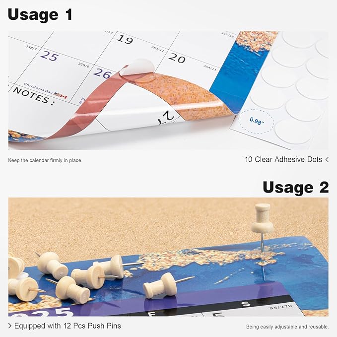 - ✨ Laminated Calendar with Dates: Waterproof wall calendar comes with a mini eraser, four dry-erase markers, 12 push pins, and 10 transparent round stickers. 2 yearly calendar planner covers the time range from Jan 2024 to Dec 2026, making it perfect for long-term use.