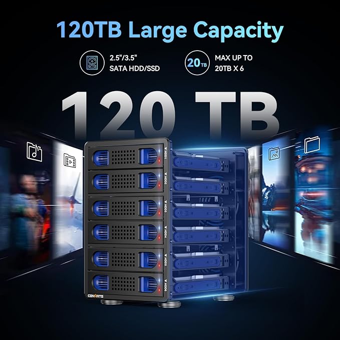 6 Bay Hard Drive Enclosure with Cooling Fan for 2.5“/3.5" SATA HDD/SSD with USB A/C 3.0, Support Hot Swappable, Daisy Chain Expansion, Tool-Free HDD Enclosure, DAS(NO RAID/NAS)