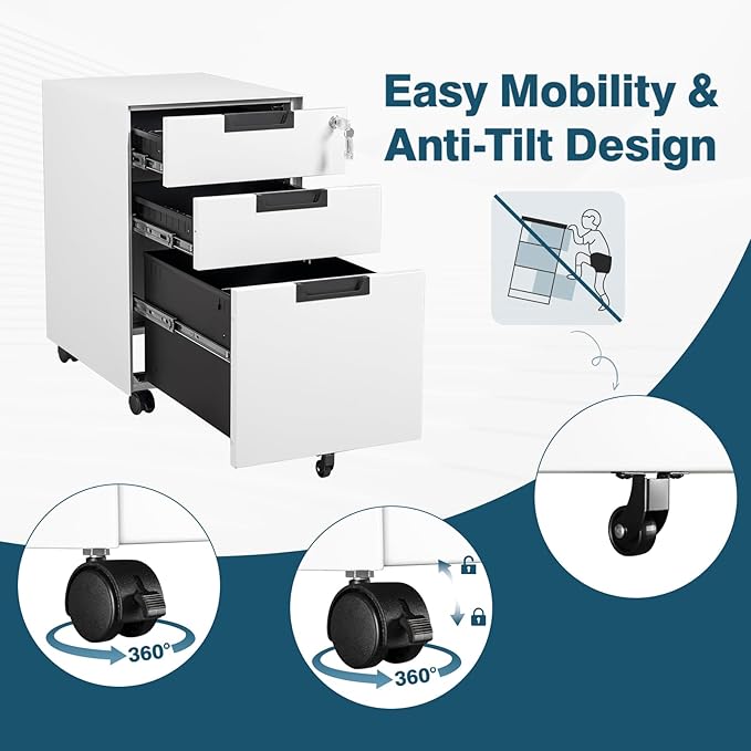 - 【Rolling Fill Cabinet on Wheels】: Equipped with 2 lockable casters + 2 x 360° swivel casters + 1x anti-tilt wheel, you can move it easily and safely. 360° swivel casters go to any direction easily, while lockable casters offer braking and the center support wheel prevents tipping.