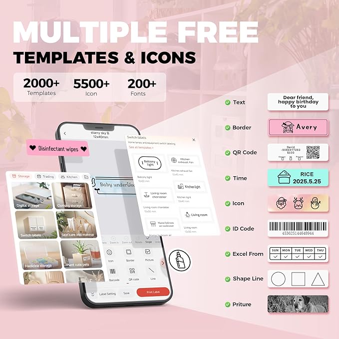 Label Maker Machine with Tape, Label Makers with Multiple Templates, Mini Label Maker Widely Used in Home Office School Organization, Bluetooth Label Printer Easy to Use for Small Labels, Pink