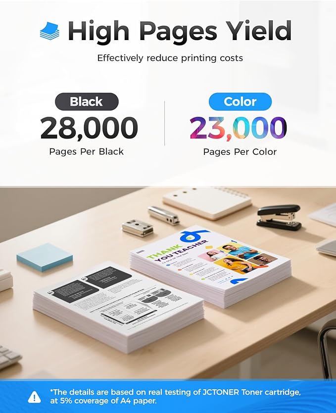 - The latest chip version: The JCTONER toner cartridges are equipped with the latest version of built-in chips, ensuring perfect compatibility between each toner cartridge and the printer. This enables you to print efficiently while maintaining stability and reliability, making installation convenient without the need for manual adjustments. All JCTONER toner cartridges have undergone strict quality testing and have obtained ISO9001 certification. High-quality toner cartridges can meet the demand for high printing volume. The fine toner ensures clear and stain-free printing results and extends the lifespan of the printer. You can purchase with confidence.