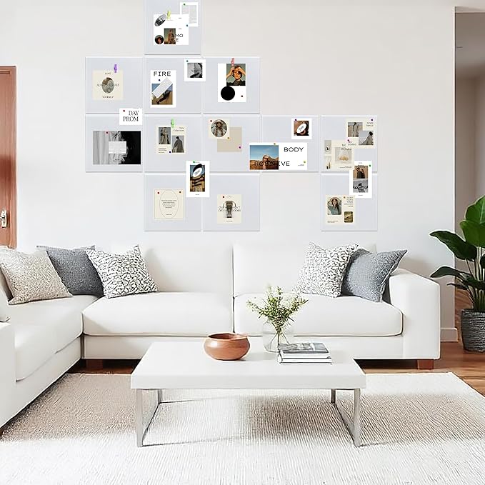 AKTOP White Cork Bulletin Board 12x12, 1/2" Thick Felt Cork Board Tiles 12 Pack, Small Square Pin Board for Wall, Self Adhesive Corkboards with 120 Push Pin Wood Clips for School, Home & Office