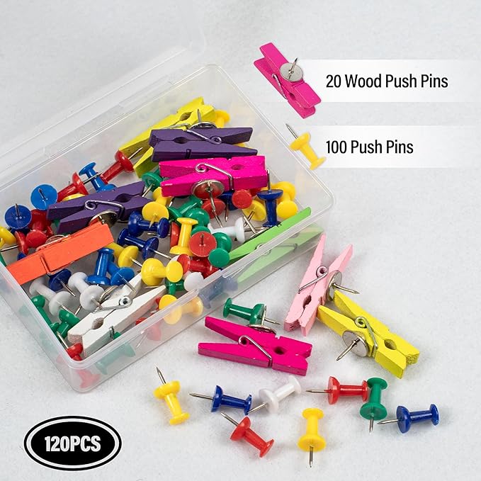 - Corkboard Set: 20 natural wood clips, beautiful and practical, hold more than 30 sheets of office A4 paper; 100 color pins, sturdy and durable, pin important papers and messages to cork boards; 1 plastic box, orderly placement of small parts