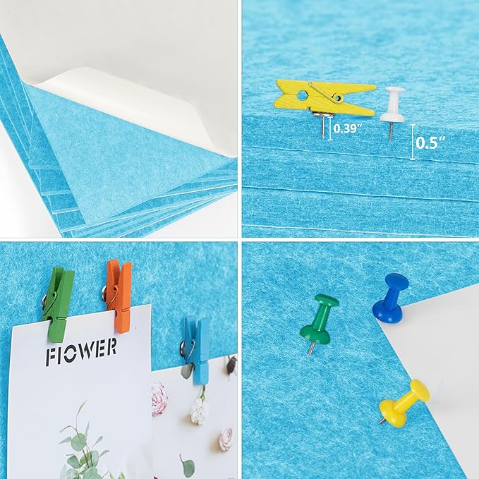 AKTOP Cork Bulletin Board 12x12, 1/2" Thick Felt Cork Board Tiles 12 Pack, Small Square Pin Board for Wall, Self Adhesive Corkboards with 120 Push Pin Wood Clips for School, Home & Office, Baby Blue