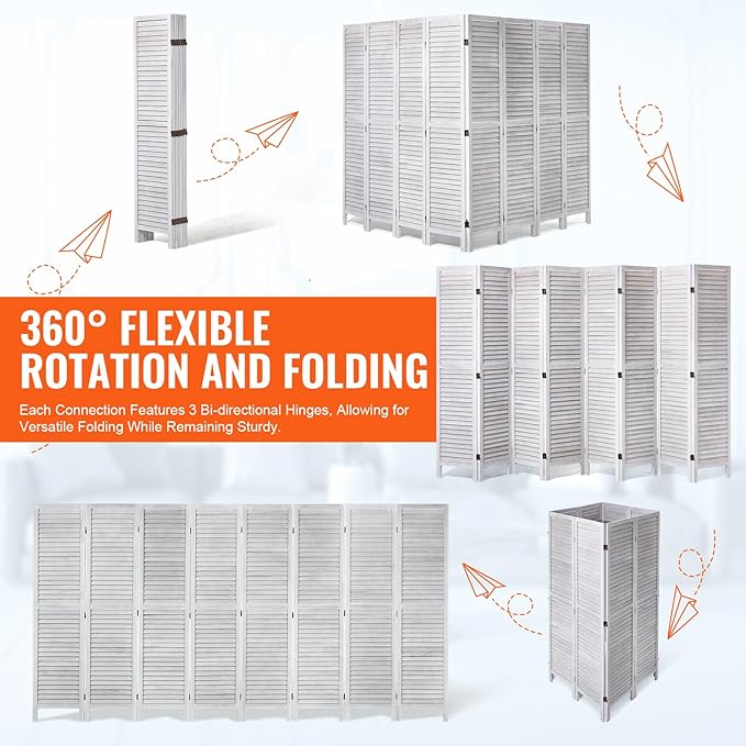 - Flexible 360Β° Movement: Each room divider panel connects with three sturdy double-directional hinges, allowing you to rotate and fold at any angle. When not using it, fold it and tuck it away in a corner. For added stability, arrange it in a zigzag pattern to keep it from tipping over when fully extended.
