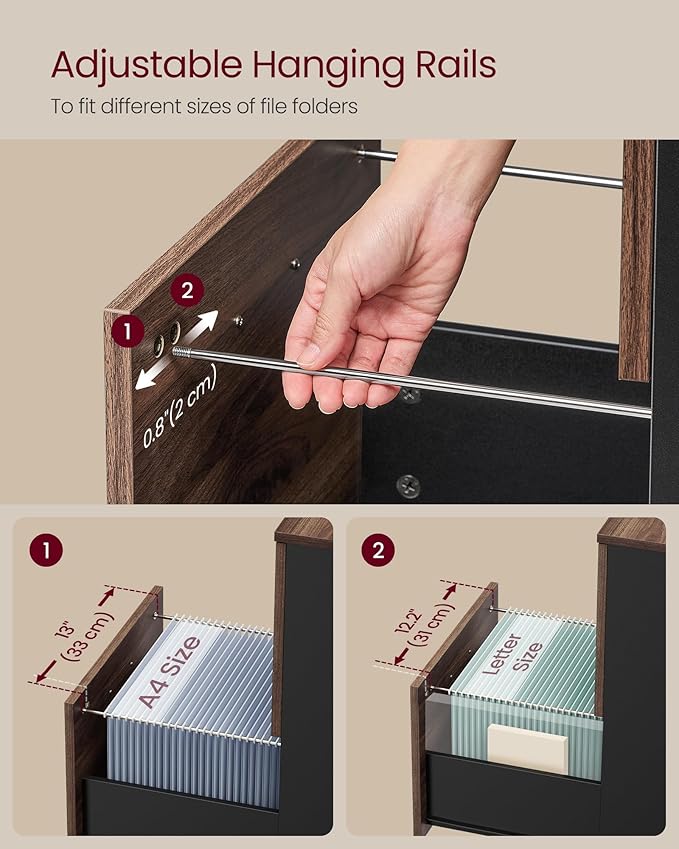- 【PLENTY OF STORAGE】With 2 spacious drawers, this file cabinet can neatly store 90-130 sheets of documents in each, meeting your daily filing needs. Adjustable hanging rails inside the drawers fit both A4 and letter size folders