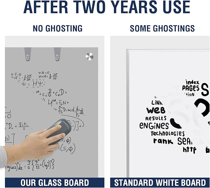 - PREMIUM GLASS WHITEBOARD - 36 x 24 inches glass whiteboard comes with smooth, strong and durable tempered glass surface, which is resists scratches and dents. This premium glass allows you to write, erase and rewrite on a clean surface every time.