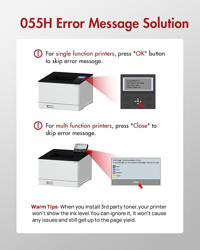 - 5. Count on 055 055H CRG-055H toner replacement for Canon 055 toner cartridge set for a fast, high-quality, and reliable printing experience. Save time by avoiding common printing problems such as streaks, smudges, and leaking