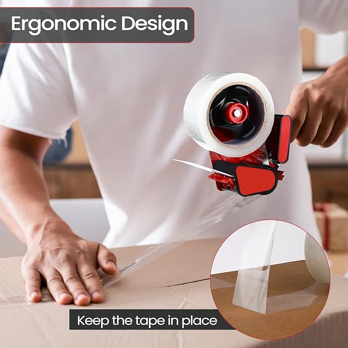 - Easy to Use: our packaging tape with dispenser is safe and simple to use; Place the tape on the roller, tear the tape, and thread one end through the metal sheet; Is ready to use; After it makes sealing multiple package easily without losing many time