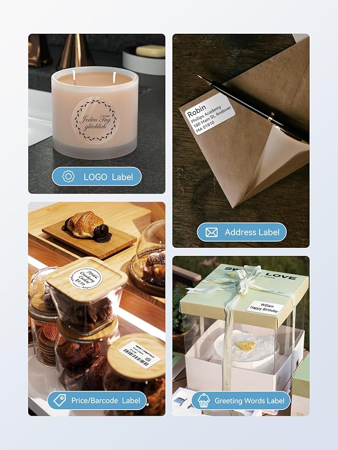 - Widely Used: This Bluetooth label printer supports label widths from 20 to 50mm, making it suitable for various uses. At home, it helps organize kitchen jars, bottles, storage containers, homemade food, and addresses. For small businesses, it’s ideal for printing price tags, product details, QR codes, barcodes and brand logos. In schools, it can be used for name tags, teacher feedback labels, clothing labels, and cup labels.