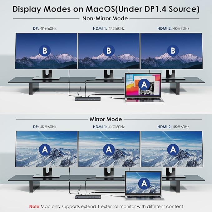 - 8K Ultra HD & Triple Display: Take your visual experience to the next level with our USB C dock. Equipped with dual HDMI and DP ports, it supports up to triple 4K@60Hz video output for Mac users (Under DP1.4). Single 8K@30Hz is only available for Windows PC via the DisplayPort. Ideal for video editors, image designers, game players etc. NOTE: Some Windows laptops only support 3 monitors(including the host screen) due to their graphic card limitations