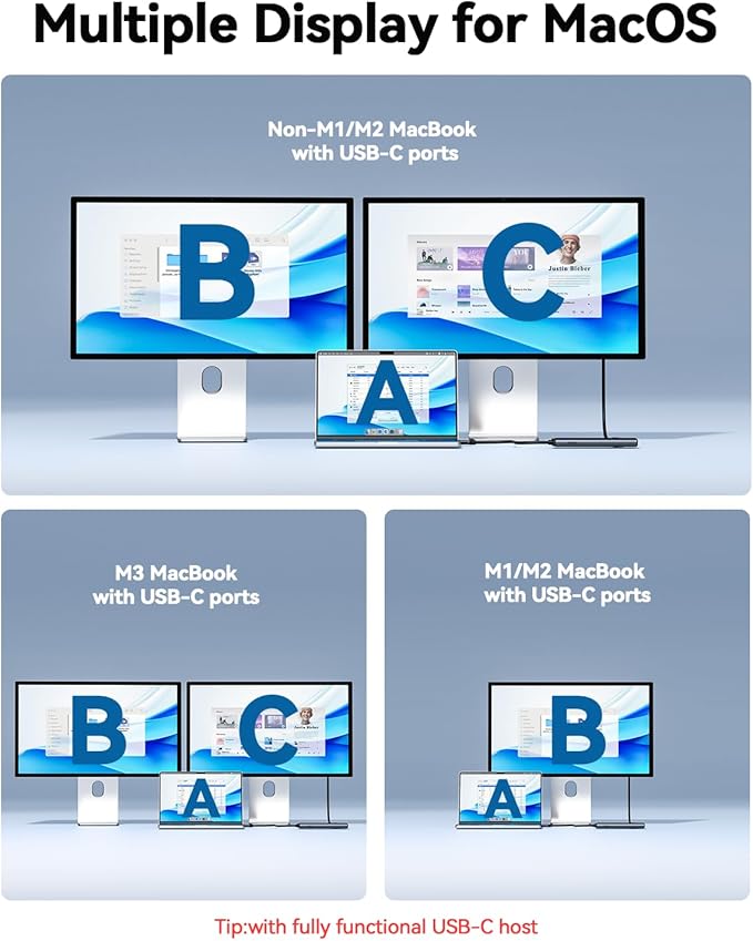 - 【Single 8K/Dual 4K@60Hz Hdmi Adapter】The dock's USB-C3.1 port and HDMI ports resolution up to single display 8K,dual 4K@60Hz. Allow the laptop/phone's contents mirror or extend to the external monitors. Stunning visual feast, ideal for office and entertainment. (Note: 1、For MacOS 4/USB 4 laptops, both single and dual display are 4K/60hz; 2、For Mac M1/M2 chip, only support single 1 display 4K@60Hz).
