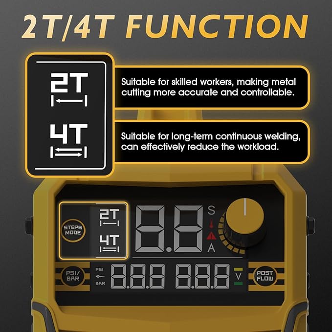 - 2T/4T FUNCTION: Rear time function with an adjustment range of 5-20 seconds. Post flow time to cool the weld head and extend the life of the weld metal. 2T/4T function selects automatic cutting to free your fingers, 2T for semi-automatic cutting control and 4T for fully automatic cutting control. Free your fingers for easy cutting