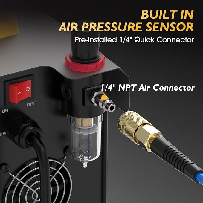 - Air Sensor Technology: The air sensor built into the machine will display the air pressure on the front panel of the machine. The back of the machine comes with a quick connect 1/4 NPT air connector air filter fitting and built-in regulator