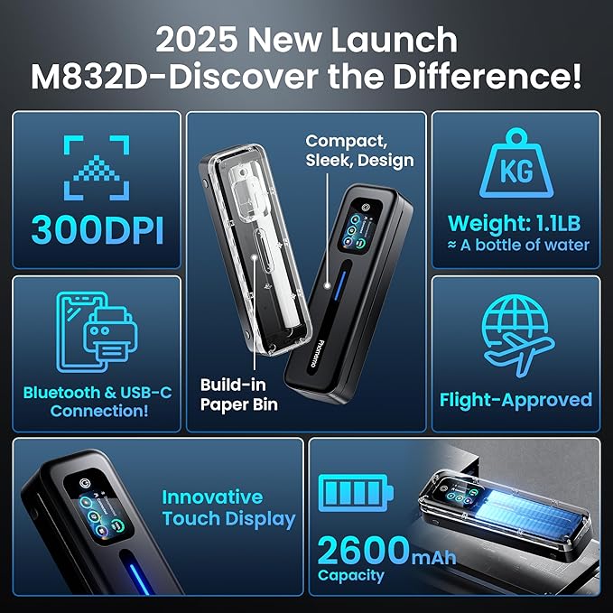 - User-Friendly Touchscreen Smart Printer: The M832D mobile printer features an upgraded smart digital display offers easy access to battery and connection status, and intelligently identifies the paper placement for precise printing, making it incredibly easy to monitor and adjust settings, even for first-time users or the elderly. For example, a beginner can easily check the battery level before printing or adjust paper settings without any guesswork. This intuitive display ensures a seamless printing experience, helping users achieve the best print results quickly and effortlessly