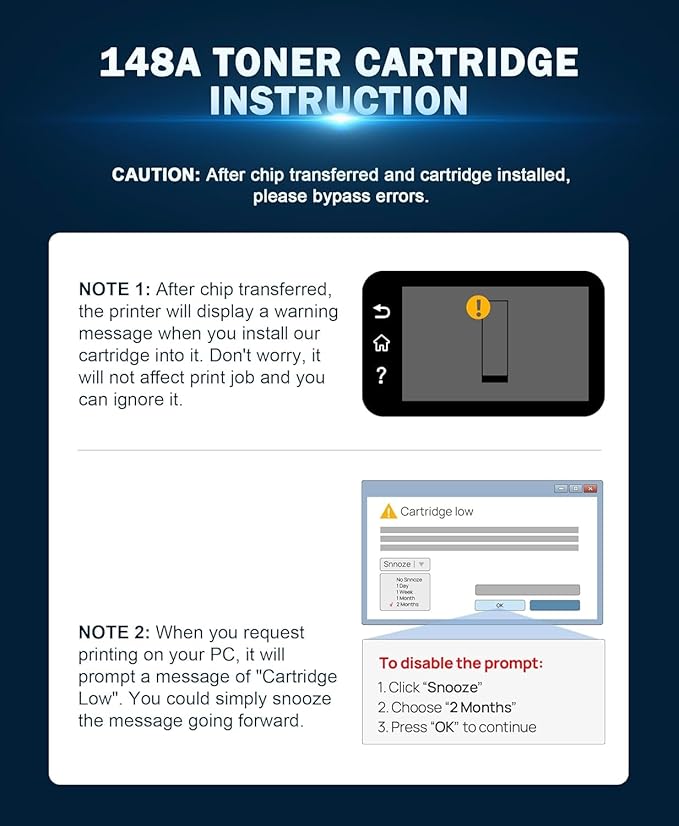 - No Chip: Make sure you have the OEM 148A toner cartridge and follow the instructions to remove it from OEM toner and install it to our product (๐๐จ๐ฎ ๐๐จ๐ฎ๐ฅ๐ ๐๐ข๐ง๐ ๐ญ๐ก๐ ๐ข๐ง๐ฌ๐ญ๐ซ๐ฎ๐๐ญ๐ข๐จ๐ง๐ฌ ๐ข๐ง ๐ฌ๐ข๐๐ ๐ฉ๐ข๐๐ญ๐ฎ๐ซ๐ ๐๐ง๐ ๐+ ๐๐จ๐ง๐ญ๐๐ง๐ญ)