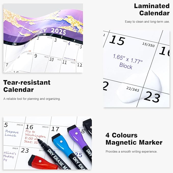 - ✨ Laminated Calendar with Dates: Waterproof wall calendar comes with a mini eraser, four dry-erase markers, 12 push pins, and 10 transparent round stickers. 12 months calendar covers the time range from July 2025 to June 2027, making it perfect for long-term use.