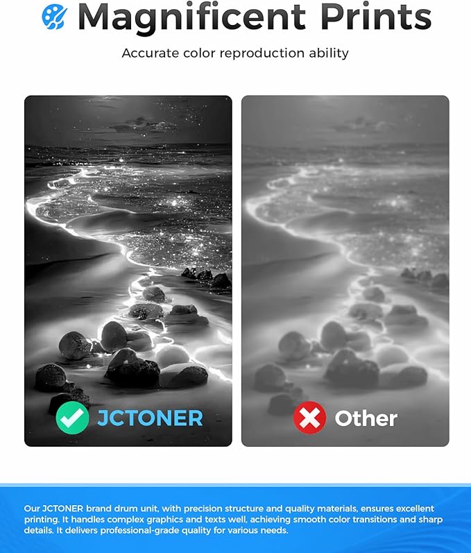 - The latest chip version: The JCTONER toner cartridges are equipped with the latest version of built-in chips, ensuring perfect compatibility between each toner cartridge and the printer. This enables you to print efficiently while maintaining stability and reliability, making installation convenient without the need for manual adjustments. All JCTONER toner cartridges have undergone strict quality testing and have obtained ISO9001 certification. High-quality toner cartridges can meet the demand for high printing volume. The fine toner ensures clear and stain-free printing results and extends the lifespan of the printer. You can purchase with confidence.