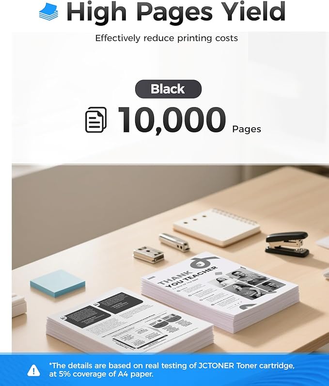 - The latest chip version: The JCTONER toner cartridges are equipped with the latest version of built-in chips, ensuring perfect compatibility between each toner cartridge and the printer. This enables you to print efficiently while maintaining stability and reliability, making installation convenient without the need for manual adjustments. All JCTONER toner cartridges have undergone strict quality testing and have obtained ISO9001 certification. High-quality toner cartridges can meet the demand for high printing volume. The fine toner ensures clear and stain-free printing results and extends the lifespan of the printer. You can purchase with confidence.