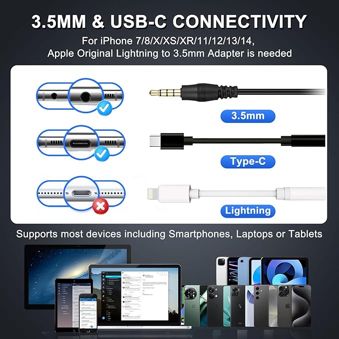 - 3.5MM JACK/TYPE-C CONNECTION - This 3.5mm wired headset includes a USB Type C to 3.5mm Headset Jack Adapter. Compatible with PC, Tablet, Mac, Laptop, iPhone Android Cell Phone, providing seamless connectivity with any device with 3.5mm or USB-C Port. COMPATIBILITY REMINDER: For iPhone 7/8/X/XS/XR/11/12/13/14, it is essential to use the 3.5mm to Lightning adapter from Apple's Official Flagship Store; otherwise, there may be incompatibility issues with some software.