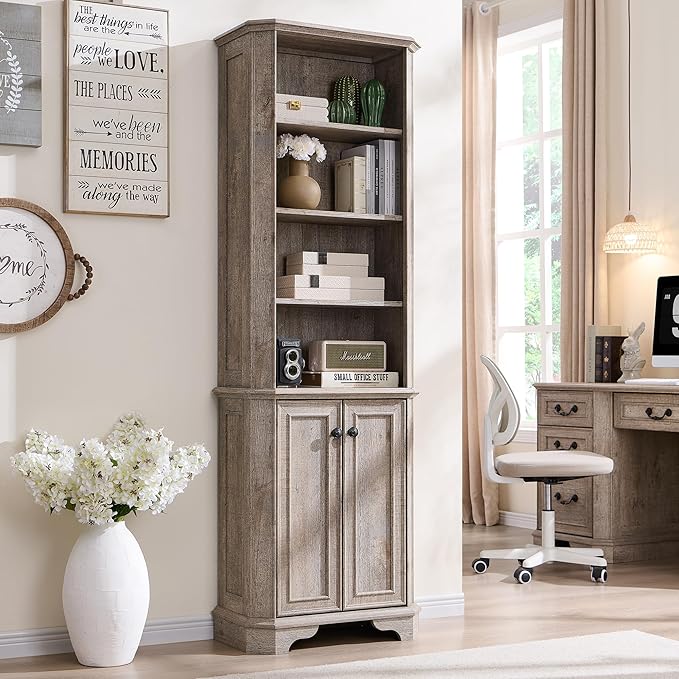 - Elegant & Sturdy 6-Tier Farmhouse Bookshelf with Farmhouse Charm: Upgrade your home office or living space with this 6-tier wood bookshelf, measuring 23.5”W x 11.7”D x 72”H. Designed to double as both a bookcase and a storage cabinet, it blends Victorian-style elegance with modern durability. The framed door fronts, hand-polished vintage mushroom knob, and a natural wood grain finish create a refined yet rustic aesthetic, enhancing any office or home décor