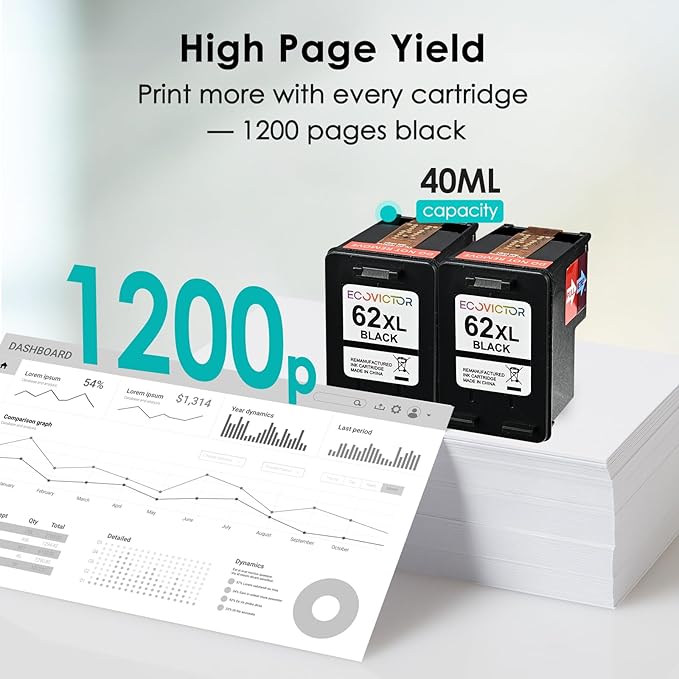 - Long-Lasting Page Yield: EcoVictor 62xl ink cartridges black for hp 62 black ink cartridge prints up to 600 pages each (at 5% coverage). EcoVictor for hp 62xl ink cartridge combo pack is perfect for home, school, or office use. Enjoy long-lasting printing performance without the hassle of frequent replacements.