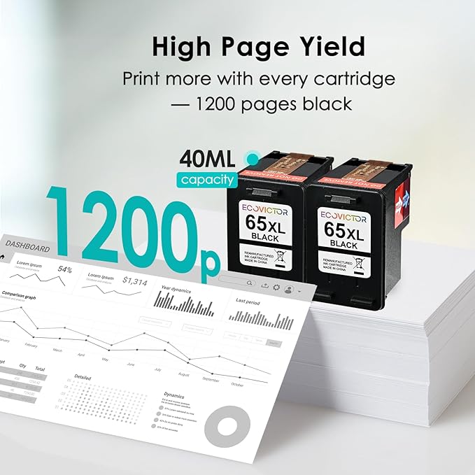 - Long-Lasting Page Yield: EcoVictor 65xl ink cartridges black for hp 65 black ink cartridge prints up to 600 pages each (at 5% coverage). EcoVictor for hp 65xl black ink cartridge is perfect for home, school, or office use. Enjoy long-lasting printing performance without the hassle of frequent replacements.