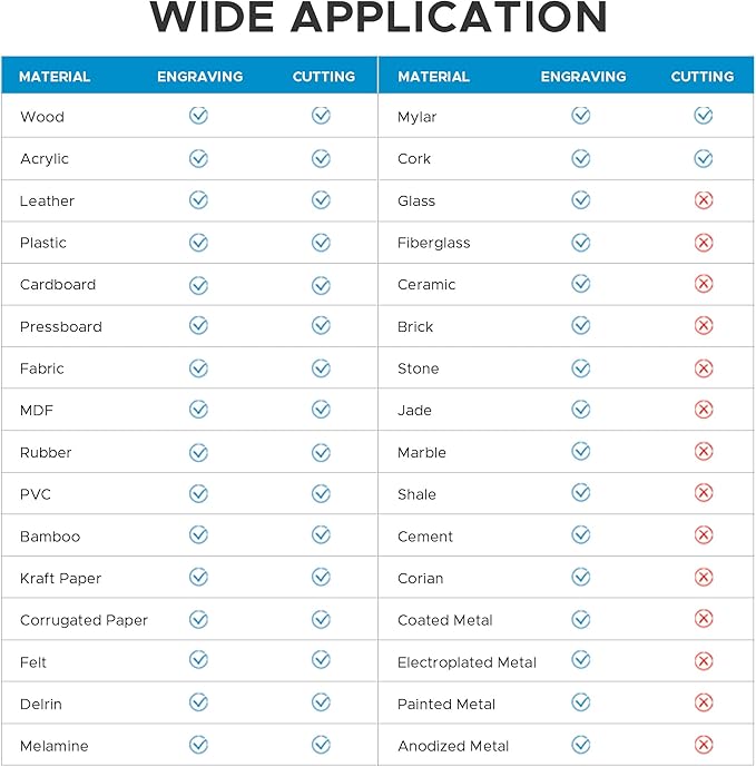 - Bring Your Creations to Life: OMTech's 90W CO2 laser engraver delivers precise cutting and engraving, capable of cutting up to 0.4" deep in wood and engraving on materials like glass, acrylic, and leather at 600 mm/s
