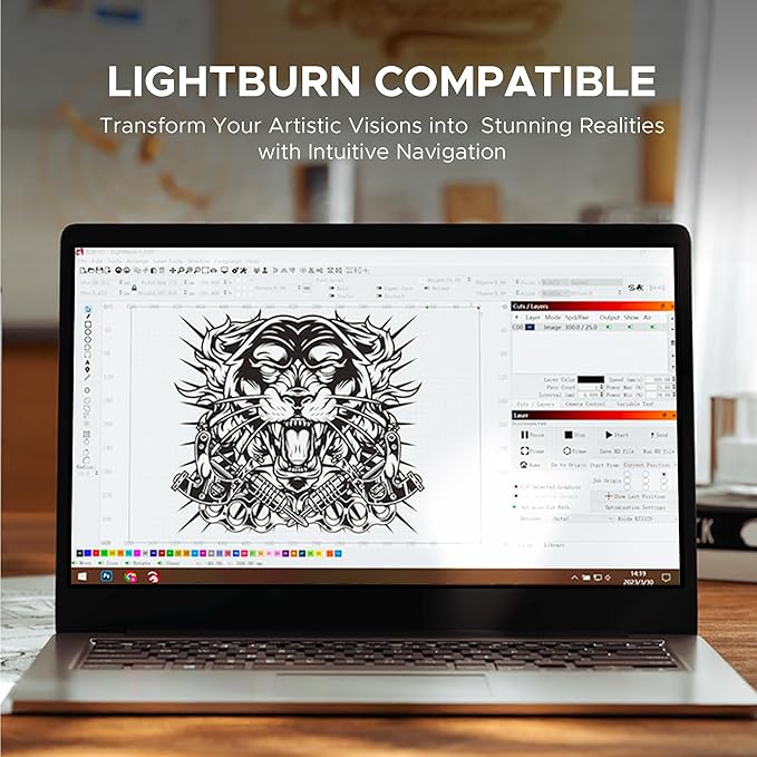 - Safety First: Our flame-retardant viewing window ensures safety while the automatic cover interlock halts the laser when the lid is opened. The built-in air assist clears smoke and dust, keeping a clean workspace for clear, precise engravings