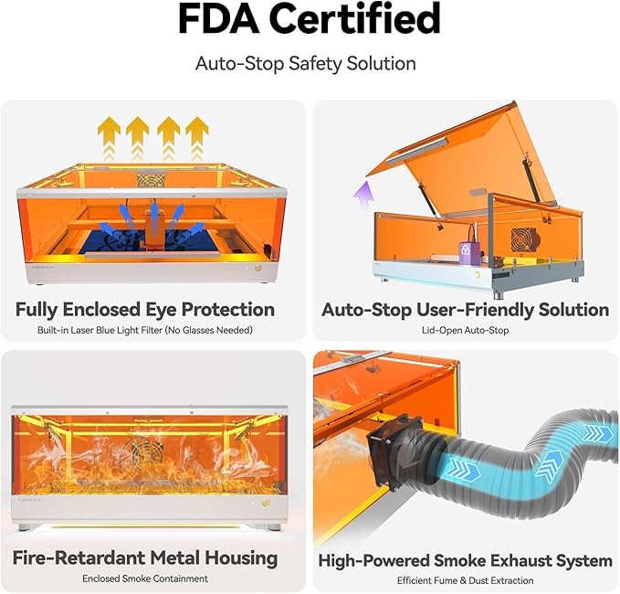 - 【Class 1 Safety Certified Machine】This certified Class 1 cutting and engraving machine provides safety assurance for users at all levels, from beginners to professionals. Its smart enclosure integrates powerful features including smoke exhaust, laser blocking, auxiliary lighting, and safety interlock systems. The 360° fully-enclosed lid filters 99% of laser emissions, eliminating the need for additional enclosures or protective goggles. The laser module instantly deactivates when the lid is gently opened, ensuring continuous protection for both you and your artwork.