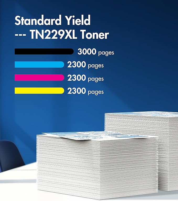 - 3. High Page Yield: Up to 3000 pages for TN229XL bk TN229 Black toner and 2300 pages for per TN-229XL color toner (TN229XL C/TN229XL M/TN229XL Y), (Letter/A4, at 5% coverage) | Also available for TN229 toner