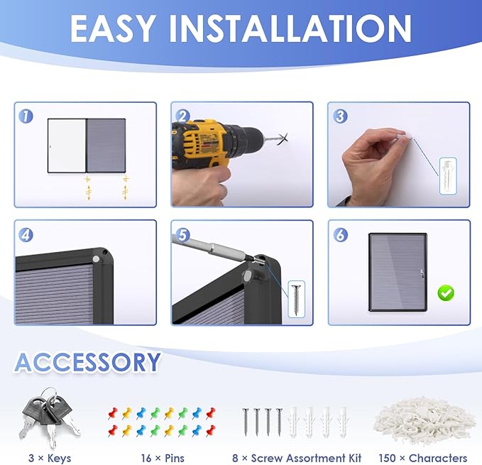 - π§ Easy To Install βThe changeable letter board includes top and bottom metal brackets and mounting hardware. The sign board can be installed on most wall types with included instructions