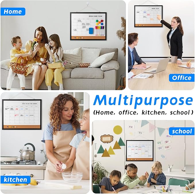 - ✔️ 【2-in-1 Multi-Function Design】This product combines a magnetic whiteboard, calendar, and cork bulletin board into a space-saving 17" x 13" frame. Easily record schedules, work plans, study tasks, meal plans, and more.