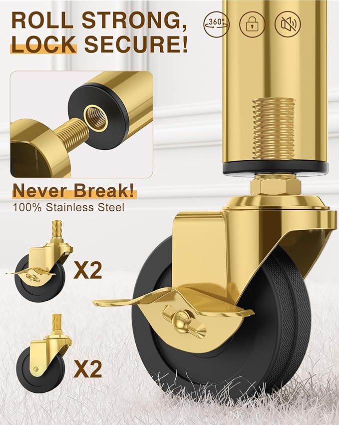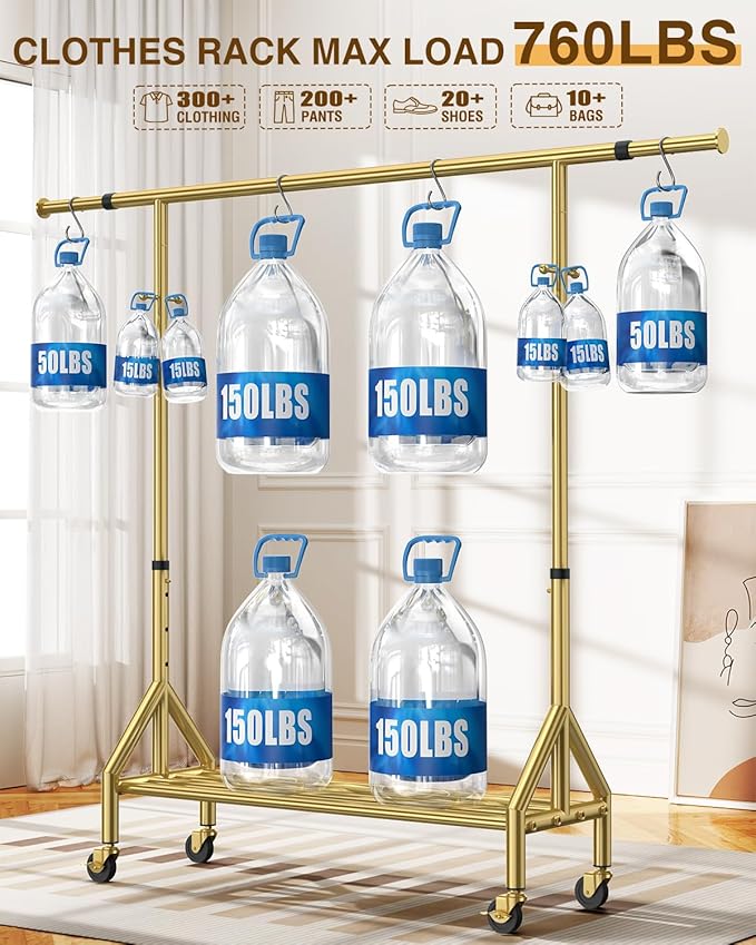 Upgraded 100% Stainless Steel Clothing Rack Load 760LBS, Heavy Duty Clothes Racks with Larger & Sturdy Wheel, Extendable & Adjustable Rolling Garment with Shelves (1 Single Rod, Gold)