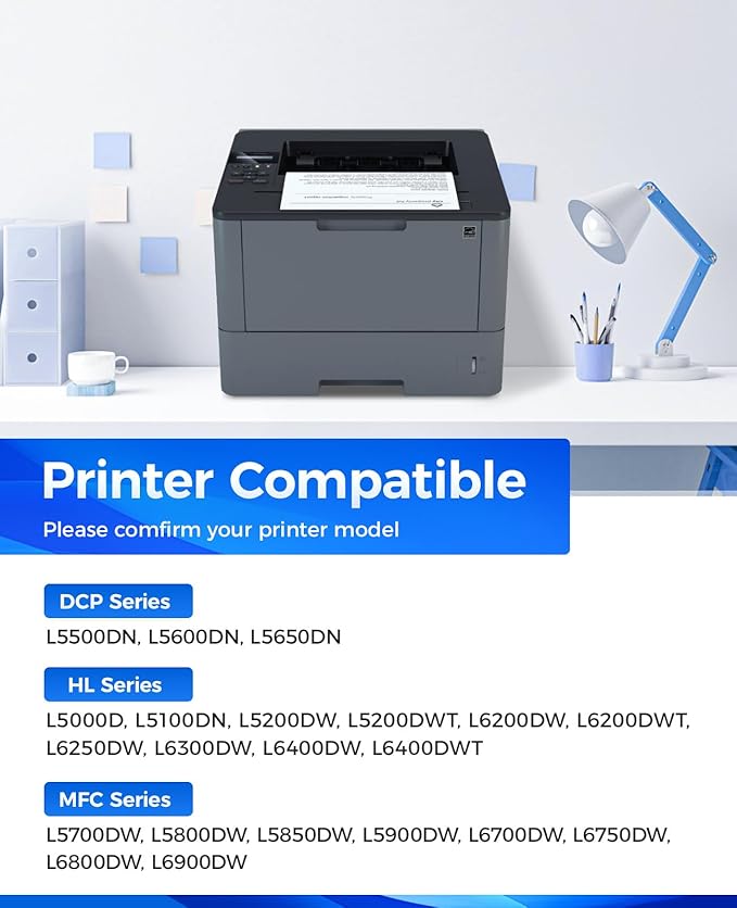 - Compatible Printers: Compatible with Brother DCP Printer Series:DCP-L5500DN, DCP-L5600DN, DCP-L5650DN, HL Printer Series:HL-L5000D, HL-L5100DN, HL-L5200DW, HL-L5200DWT, HL-L6200DW, HL-L6200DWT, HL-L6250DW, HL-L6300DW, HL-L6400DW, HL-L6400DWT, MFC Printer Series:MFC-L5700DW, MFC-L5800DW, MFC-L5850DW, MFC-L5900DW, MFC-L6700DW, MFC-L6750DW, MFC-L6800DW, MFC-L6900DW.