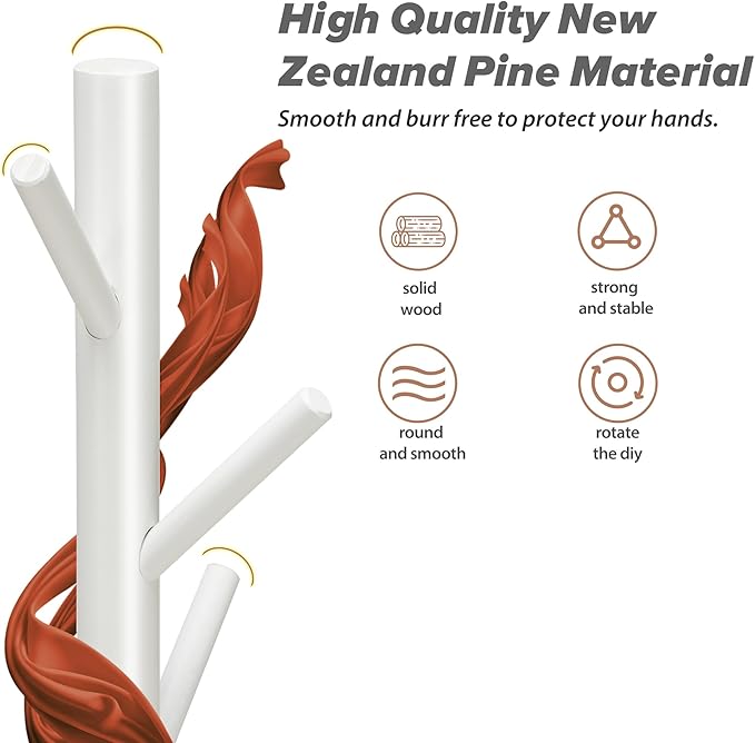 - 【8 Hooks & Save Space】The coat rack with 8 smooth hooks made of high quality New Zealand pine material, which can hang clothes, hats, bags, umbrellas and other items. The solid load-bearing performance is good.