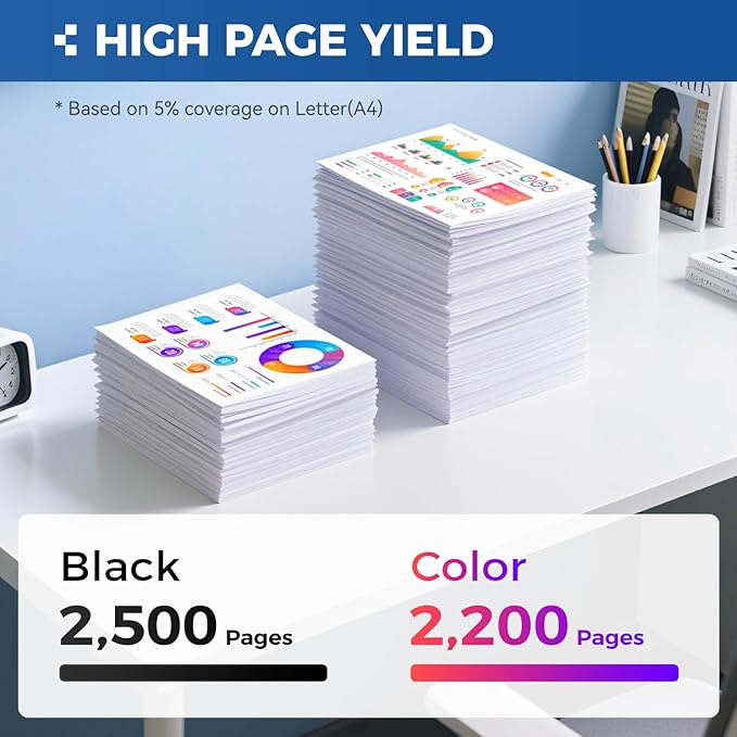 - Page Yield: Up to Black is 2,500 pages per black cartridge and Color is 2,200 Pages per color cartridge (Letter/A4, at 5% Coverage).