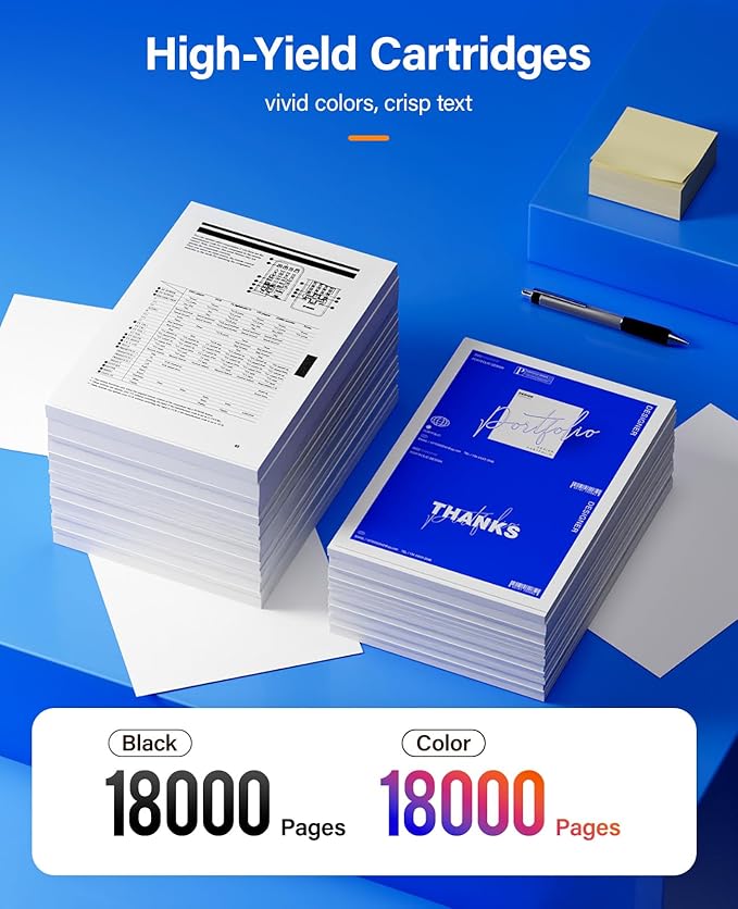 - Page Yield: Up to Black is 18,000 pages per black cartridge and Color is 18,000 Pages per color cartridge (Letter/A4, at 5% Coverage).