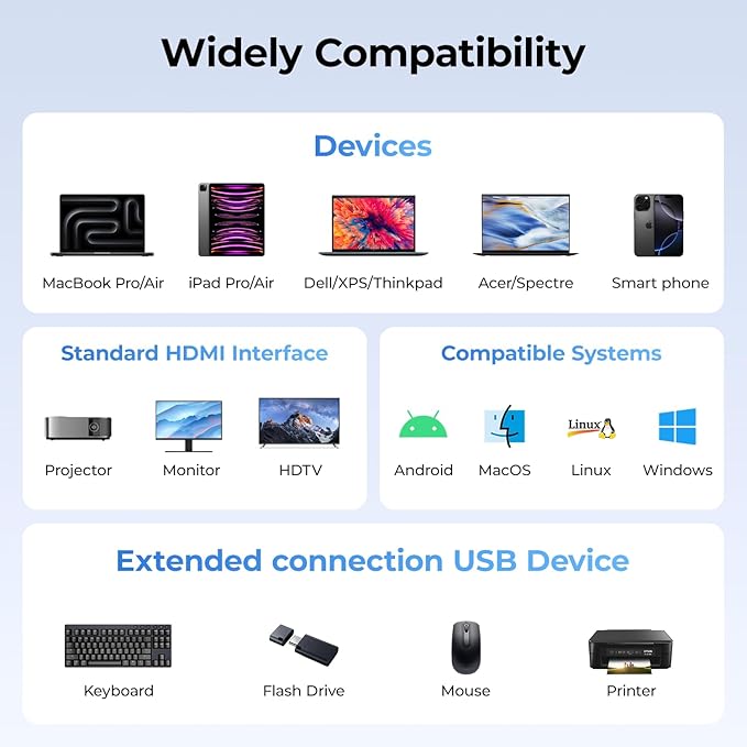 - Wide Device & OS Compatibility: Engineered with premium aluminum housing for durability and superior heat dissipation, this USB-C to HDMI adapter boasts exceptional compatibility. Works seamlessly with laptops (MacBook Pro/Air, Dell XPS, HP, Acer, Surface), tablets (iPad Pro/Air), smartphones, Nintendo Switch, and Steam Deck across Windows, ChromeOS, Linux, and macOS 10.5+. Note: Not compatible with iPhone/iPad (Lightning port) and Samsung A series phones.