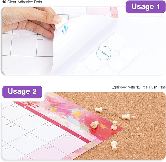 - ✨ Undated Laminated Calendar: This waterproof wall calendar comes with a mini eraser, four dry-erase markers, 10 push pins, and 10 transparent round stickers. The undated monthly calendar can be started at any time, making it perfect for long-term use.