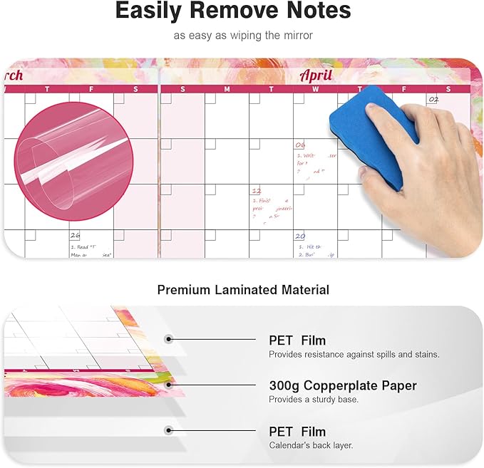 - ✨ Dry Erase Wall Calendar : is made of PET Film and 300 grams Copperplate Paper, providing a durable surface that resists scratches and smudges, while the sturdy Copperplate Paper backing keeps it in place without curling.