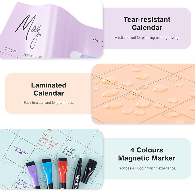 - ✨ Undated Laminated Calendar: This waterproof wall calendar comes with a mini eraser, four dry-erase markers, 50 push pins, and 50 transparent round stickers. The undated monthly calendar can be started at any time, making it perfect for long-term use.