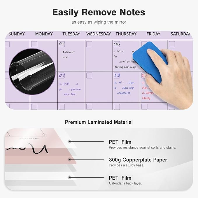 - ✨ Dry Erase Wall Calendar : is made of PET Film and 300 grams Copperplate Paper, providing a durable surface that resists scratches and smudges, while the sturdy Copperplate Paper backing keeps it in place without curling.