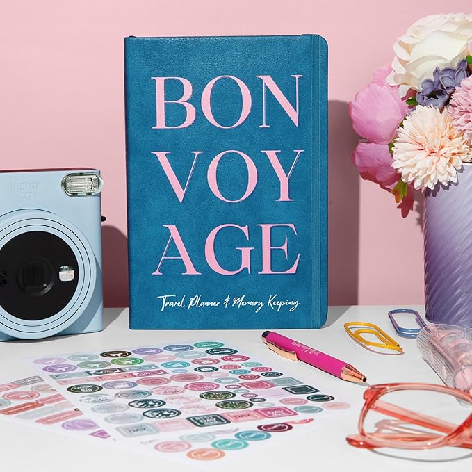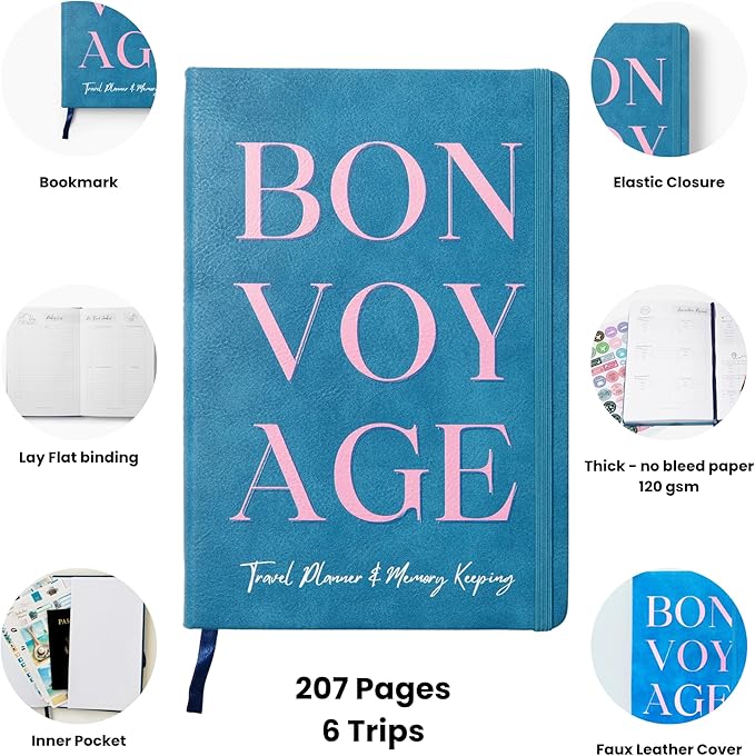 - A5 SIZE & PREMIUM QUALITY DESIGN – This travel planner features a stylish eco-leather hardcover, thick 120gsm paper to prevent ink bleed, elastic band closure, ribbon bookmark, inner pocket for keepsakes and stickers. Sized at 5.8" x 8.3", it's perfect for travel.